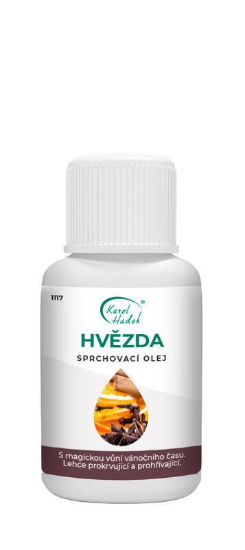 Sprchovací olej Hvězda s příjemnou, lehce magickou vůní. Teplá sladká skořice podbarvená pomerančem a badyánem doplněná borovicí a amyrisem mohou navozovat vánoční atmosféru.